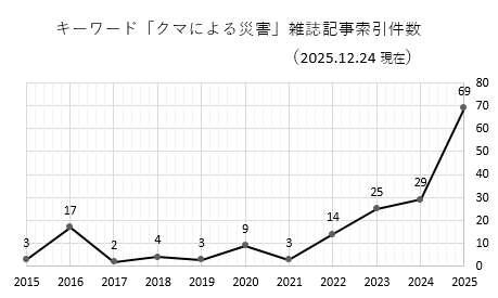 Web OYA-bunkoのキーワード「クマによる災害」の記事索引件数は2022年頃から増加していましたが、2025年の件数(12月24日現在)は69件と、前年の2倍以上に跳ね上がっています。