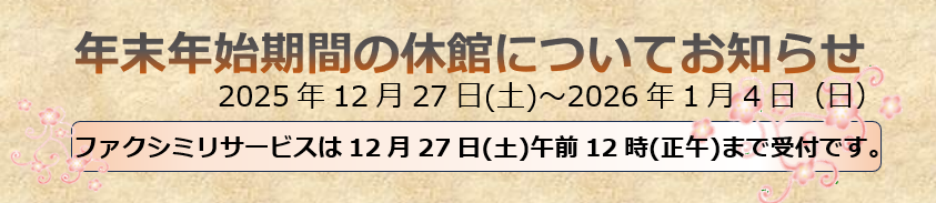 【重要】年末年始期間(12/27~1/4)の休館についてのお知らせ ※ファクシミリ・サービスは12月27日(土)午前12時(正午) までの受付です。